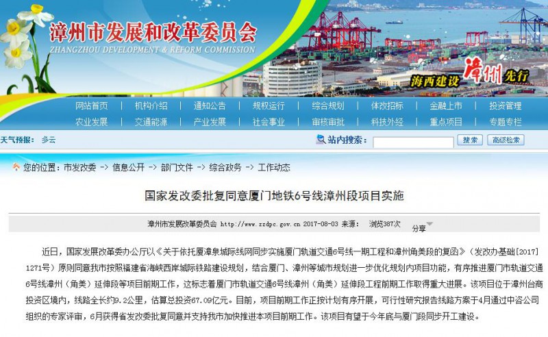 近日從漳州市發展改革委員會獲悉,國家發改委已經批復同意廈門地鐵6號線漳州段項目的實施,該項目有望于2017年底與廈門段同步開工建設。具體公告內容如下: