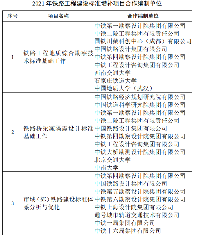 根據《鐵路工程建設標準管理辦法》(國鐵科法〔2014〕24號)規定,國家鐵路局規劃與標準研究院在公開征集、專家論證的基礎上,確定了2021年鐵路工程建設標準增補項目合作編制單位選擇方案,現予公示: