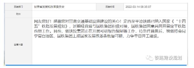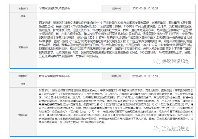 近日,甘肅省發(fā)改委在官網(wǎng)主任信箱答復(fù)了網(wǎng)友關(guān)于平慶鐵路建設(shè)標(biāo)準(zhǔn)問(wèn)題的信件,詳情如下: