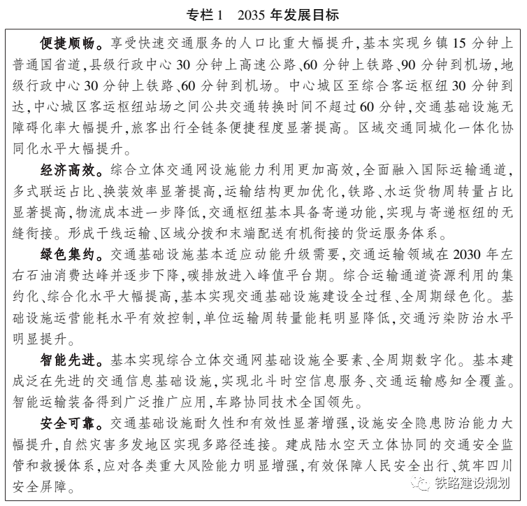 到2035年,基本建成便捷順暢、經(jīng)濟高效、綠色集約、智能先進、安全可靠的現(xiàn)代化高質(zhì)量四川省綜合立體交通網(wǎng);基本建成全國交通“第四極” ,“四向八廊” 戰(zhàn)略性綜合交通走廊通歐達海,國際性綜合交通樞紐集群聯(lián)通全球。