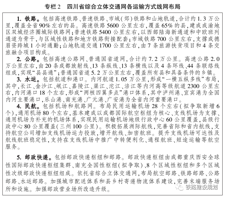 在構(gòu)建完善的綜合立體交通網(wǎng)方面,根據(jù)《綱要》,到 2035年,四川省綜合立體交通網(wǎng)實體線網(wǎng)總規(guī)模9.5萬公里左右(不含航路、郵路、農(nóng)村公路里程) ,其中,鐵路1.3萬公里左右,公路7.2萬公里左右,航道1.05萬公里左右;另規(guī)劃農(nóng)村公路41.5萬公里左右,其中縣道6.6萬公里,鄉(xiāng)道10.9萬公里,村道24.0萬公里。內(nèi)河港口18個左右,民用運輸機場28個左右,通用機場80個左右,郵政快遞樞紐10個左右。