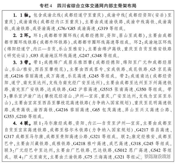 對于內(nèi)部“1軸2環(huán)3帶4聯(lián)”,《綱要》明確,“1軸”聯(lián)系成渝雙核,“2 環(huán)”串聯(lián)成都都市圈、成渝地區(qū)雙城經(jīng)濟圈主要城市,“3帶”強化對“三帶” 區(qū)域經(jīng)濟布局的交通支撐,包含成德綿廣成眉樂雅西攀,成遂南達,攀樂宜瀘渝廣達。“4聯(lián)”補充連接其余地級行政中心,包含馬爾康經(jīng)成都、資陽、內(nèi)江—自貢至瀘州—宜賓,康定經(jīng)雅安、成都至巴中,廣元經(jīng)巴中至達州,廣元至南充。