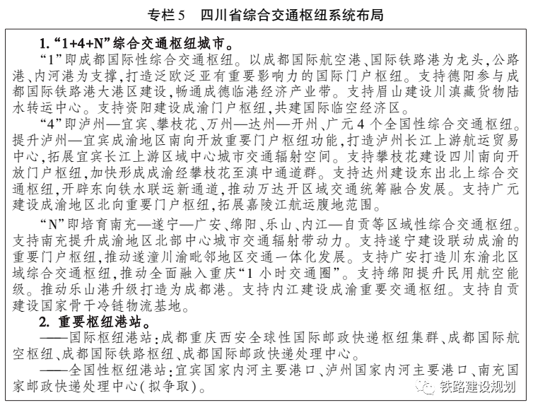 根據(jù)《綱要》,四川還將建設(shè)多層級一體化綜合交通樞紐系統(tǒng)。建設(shè)國際性綜合交通樞紐集群、樞紐城市及樞紐港站“三位一體”的綜合交通樞紐系統(tǒng)。