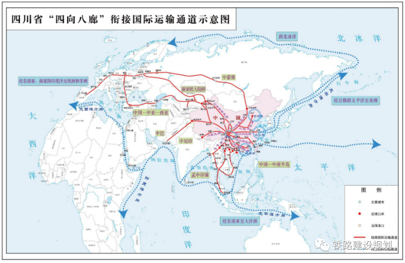 對外“四向八廊”,面向四方,構(gòu)建8條戰(zhàn)略性綜合交通走廊,打造四川“四向拓展、全域開放” 開放態(tài)勢的主骨架,承擔(dān)成渝地區(qū)雙城經(jīng)濟圈與全國主要城市群及地區(qū)的聯(lián)系功能,銜接7條陸路國際運輸通道,以及4條海上國際運輸通道。