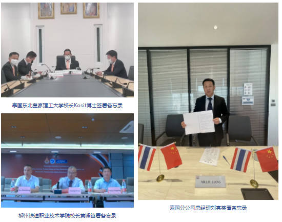 泰國東北皇家理工大學理事會主席Teerakiat博士、校長Kosit博士以及各校區的10位副校長,柳州鐵道職業技術學院校長黃鋒、副校長楊龍平,通號國際控股有限公司總經理張景方、副總經理晉云功以視頻方式見證簽約儀式。泰國東北皇家理工大學校長Kosit博士,柳州鐵道職業技術學院校長黃鋒,國際控股泰國分公司總經理劉亮分別代表各方簽署諒解備忘錄。
