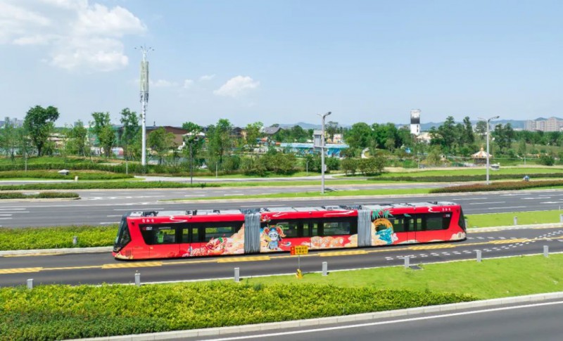 “天府號”主色調為生態綠,車身展示了綠色低碳元素,如生態城市建設、熊貓、竹文化等元素,與智軌低碳環保的特點相契合。