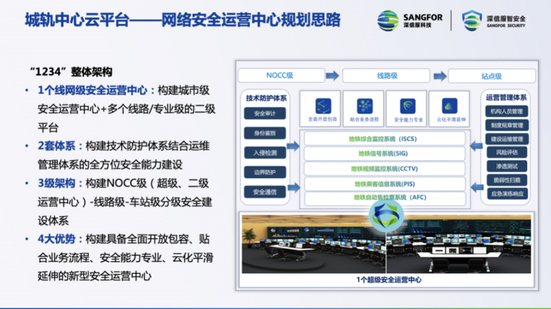 胡佳樂表示:“深信服為城軌行業量身定制的城軌云網絡安全運營平臺以1234整體架構,其中包括1個線網級安全運營中心,2套技術防護體系,NOCC級(超級、二級運營中心)-線路級-車站級分級安全建設體系3級架構,從而幫助用戶構建具備全面開放包容、貼合業務流程、安全能力專業、云化平滑延伸4大優勢的新型安全運營中心。