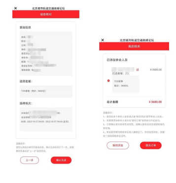 ④填寫完成后進行信息核對,核對無誤后支付參會費用(除TOD 會議外,其他論壇均免費)。訂單確認提交后將無法修改,請您務必確認報名信息及選擇套餐內容無誤再進行提交。填寫完成后可繼續添加其他參會人員信息,或完成填寫。