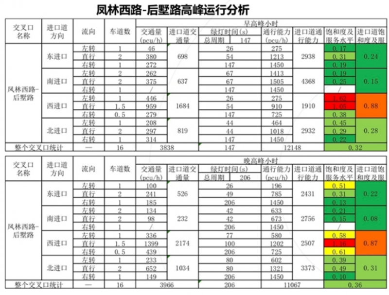 在微觀規律層面,基于交通數字底座提供的底層能力,系統可全天候保障車道級數據穩定、高質量輸出,在不同時段、不同天氣條件下交通參數均能達到90%以上精度,同時還可提供路口渠化以及信控方案信息,對單個路口進行細化分析。以鳳林西路-后墅路為例,經過計算我們可以得到各進口道各轉向的流量、通行能力以及飽和度,并分析發現西進口早晚高峰服務水平均較低。這與該路口浮動車數據分析結果和視頻觀測結論高度一致。