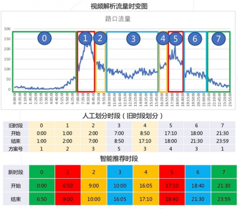 當查看系統智能推薦的時段和方案時,可發現路口時段劃分更精細,進口道流量規律更明確,同時,智能推薦的方案周期更精確,各個信號相位的時長也更精細。