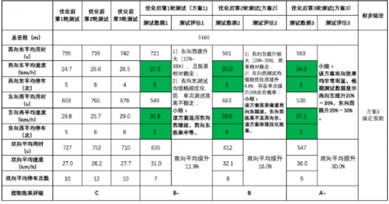 從上路實測效果看,雙向道路在平均用時、平均速度以及平均停車次數這三項指標上均有顯著提升。