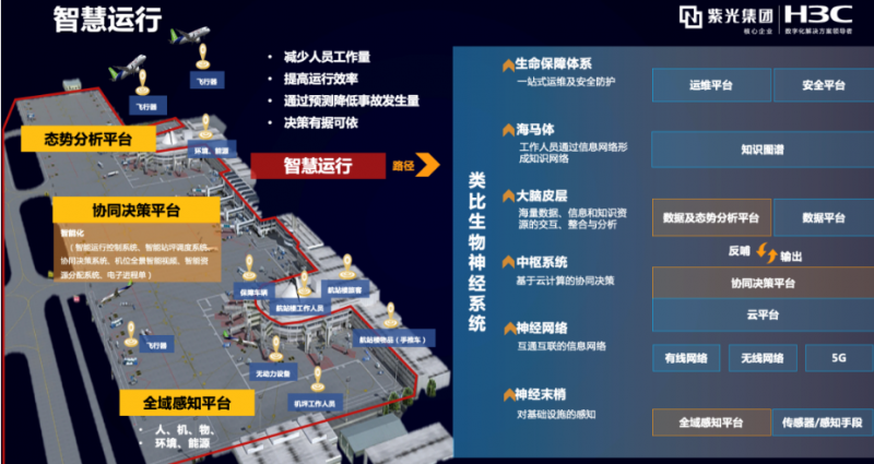 機場運行是機場業務的主體,機場整體運作的效率,與飛機起飛降落、運行資源管理、乘客貨物調度等密切相關,也成為“智慧機場”建設重點改造的方向。適逢新基建大潮,ICT基礎設施在感知、分析、決策方面的升級創新,為機場帶來了“數智”面貌。而紫光股份旗下新華三集團基于對機場運行未來形態的思考、探索和實踐,打造智慧運行解決方案,助力加快民航數字化轉型進程。
