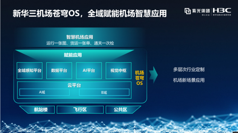 從整體管理的宏觀維度看,機場又是如何面對業務挑戰實現業務優化,并在不影響現有運行穩定的前提下,平滑完成新建業務的目標?比如,可以更直觀接觸到主業數據和效率指標,以及數據智能分析結果,包括近期的旅客人數預測、地面保障平均時間預測、過站時長預測等,以評估機場承壓能力,挖出薄弱環節,反哺業務優化。答案在于新華三智慧運行解決方案的智能數據底座——機場蒼穹OS,可以為機場提供輔助分析決策能力,大量減輕機場管理者的工作負擔。實現全機場數據的管理、開發、接入、分析和標準化,并進行全生命周期的數據管理,挖掘數據背后的價值。同時,對于機場未來面臨的新業態,機場蒼穹OS可以在不推倒現有業務的前提下,助力機場孵化旅游、物流、商業等新業務,實現無縫接入,不僅與機場越來越多元化的定位相匹配,而且開發便捷、節約成本。此外,新華三還提供了包括7*24小時不下線、4層安全體系、32個安全制度在內的保障體系,守護機場的“生命線”。