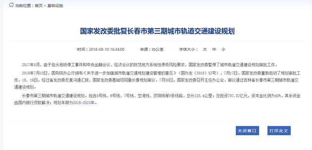 長春市第三期城市軌道交通建設(shè)規(guī)劃,包含5號線、6號線、7號線、空港線、雙陽線等8條線路,總長135.4公里;總投資787.32億元,資本金比例為40%,其余資金由國內(nèi)銀行貸款解決;規(guī)劃年限為2018-2023年。