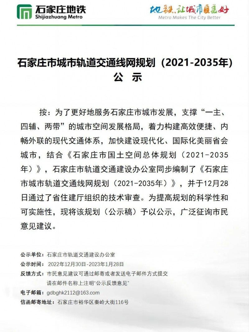 12月30日獲悉,石家莊市軌道交通建設(shè)辦公室編制了《石家莊市城市軌道交通線網(wǎng)規(guī)劃(2021-2035年)》,為提高規(guī)劃的科學(xué)性和可實(shí)施性,現(xiàn)將該規(guī)劃(公示稿)予以公示,廣泛征詢市民意見建議。