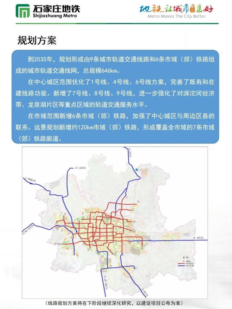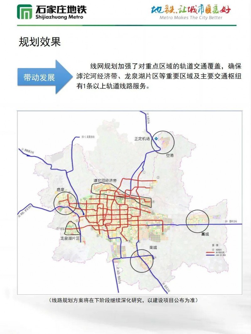 在中心城區(qū)范圍優(yōu)化了1號(hào)線、4號(hào)線、6號(hào)線方案,完善了既有和在建線路功能。新增了7號(hào)線、8號(hào)線、9號(hào)線,進(jìn)一步強(qiáng)化了對(duì)滹沱河經(jīng)濟(jì)帶、龍泉湖片區(qū)等重點(diǎn)區(qū)域的軌道交通服務(wù)水平。