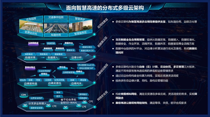 方案采用了分布式多級云架構,架構大致分為邊緣(云)計算、云邊協同、多云管理三大板塊,通過云邊協同構建全局算力網絡,實現云資源靈活調度,提供多形態邊緣計算,同構、異構云管理功能,為智慧高速多應用場景提供支撐。
