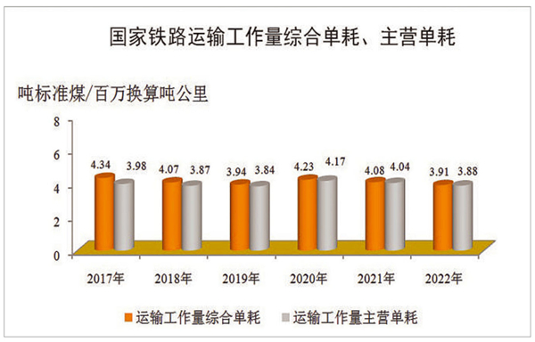 綜合能耗。國家鐵路能源消耗折算標準煤1512.58萬噸,比上年減少74.33萬噸,下降4.7%。單位運輸工作量綜合能耗3.91噸標準煤/百萬換算噸公里,比上年減少0.17噸標準煤/百萬換算噸公里,下降4.2%。單位運輸工作量主營綜合能耗3.88噸標準煤/百萬換算噸公里,比上年減少0.16噸標準煤/百萬換算噸公里,下降4.0%。