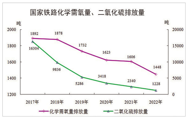 主要污染物排放量。國家鐵路化學需氧量排放量1448噸,比上年降低9.8%。二氧化硫排放量1228噸,比上年降低47.5%。