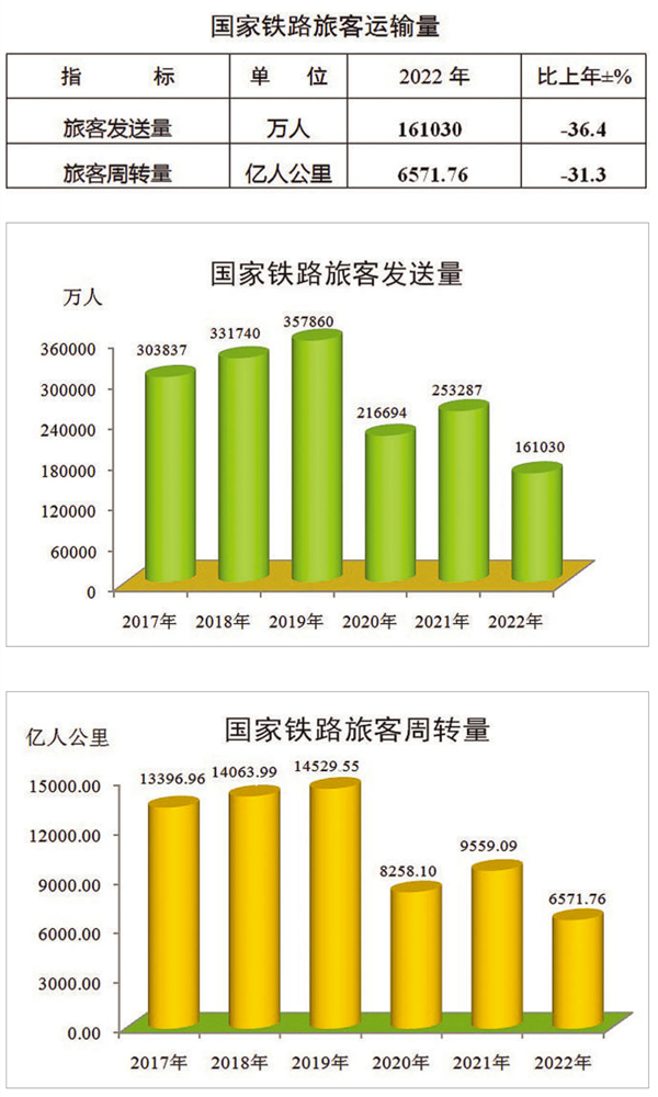 旅客運輸。國家鐵路旅客發送量完成16.10億人,比上年減少9.23億人,下降36.4%;國家鐵路旅客周轉量完成6571.76億人公里,比上年減少2987.33億人公里,下降31.3%。