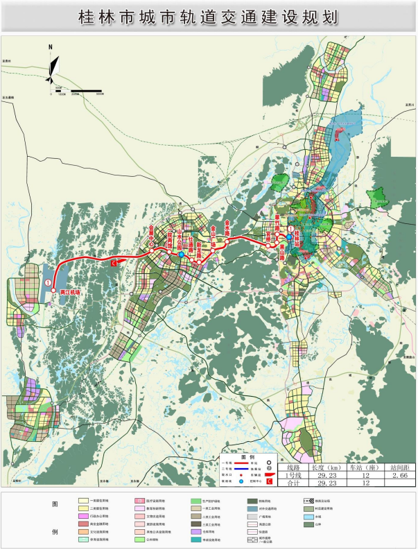 桂林市城市軌道交通1號線一期工程具體方案:1號線一期工程西起桂林兩江機場,設兩江機場地下站,向北地下敷設約1.9km后,轉至地面高架敷設,后沿機場高速南側高架敷設至臨桂新區會展中心,設會展中心站后沿公園北路路中設一院兩館、山水公園站、仕通路、新龍路站轉至人民路敷設,線路沿人民路-金水路路中設金山廣場站、金水路口、站后沿翠竹路路側高架敷設,下穿衡柳鐵路高架橋后,繼續沿翠竹路路側轉至鐵路北側敷設,設官橋站后沿黑山路設黑山路站后向北敷設至翠竹路,設翠竹路站后沿翠竹路向東敷設至線路終點桂林站。