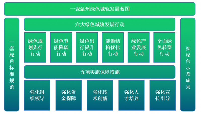 《溫州軌道交通綠色城軌發展行動方案》積極吸納各地綠色城軌發展相關經驗,結合溫州軌道交通和綠色產業發展實際,以全面完成綠色轉型為主線,四大行動原則為指導,統籌鋪畫了“16511”溫州綠色城軌發展藍圖,將重點實施“綠色規劃先行、綠色節能降碳、綠色出行提升、能源結構優化、綠色產業發展、全面綠色轉型”六大重點行動任務,詳細制定“五項保障措施”,精心編制“一套綠色標準體系”,形成“一批綠色示范成果”,引領溫州軌道交通綠色低碳、高質量發展。