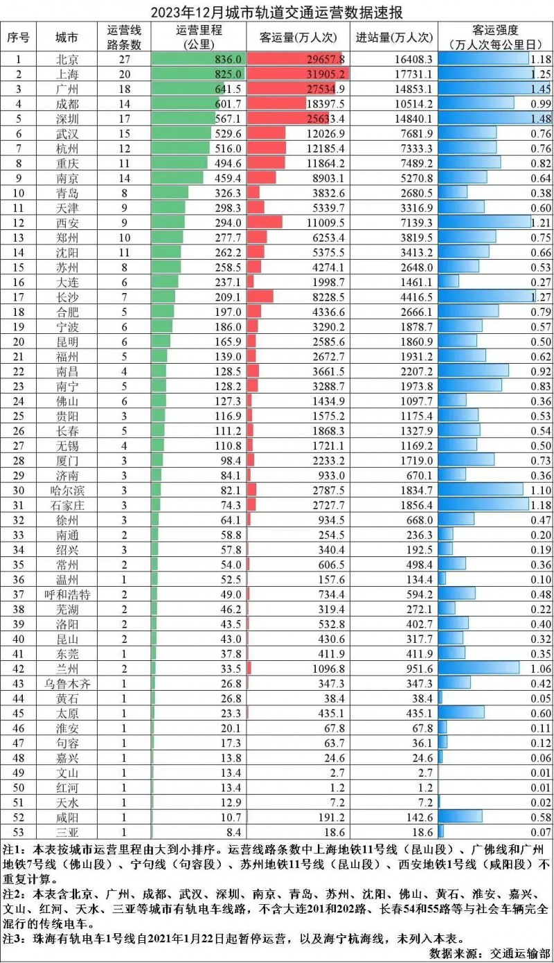 2023年12月,31個(gè)省(自治區(qū)、直轄市)和新疆生產(chǎn)建設(shè)兵團(tuán)共有55個(gè)城市開通運(yùn)營城市軌道交通線路306條,運(yùn)營里程10165.7公里,實(shí)際開行列車333萬列次,完成客運(yùn)量26.7億人次,進(jìn)站量16億人次。12月份,客運(yùn)量環(huán)比增加0.8億人次,增長3.2%,同比增加15.1億人次,增長130.1%,較2019年月均客運(yùn)量增加6.8億人次,增長34%。12月份全國總運(yùn)營里程的平均客運(yùn)強(qiáng)度為0.863萬人次每公里日,較2019年全國總運(yùn)營里程的平均客運(yùn)強(qiáng)度降低18.6%。
