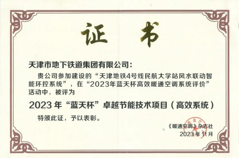 近期,2023年“藍(lán)天杯”高效暖通空調(diào)系統(tǒng)評(píng)價(jià)活動(dòng)結(jié)果公布,天津地鐵4號(hào)線民航大學(xué)站“風(fēng)-水聯(lián)動(dòng)”智能環(huán)控系統(tǒng)被評(píng)為2023年“藍(lán)天杯”卓越節(jié)能技術(shù)項(xiàng)目(高效系統(tǒng))。