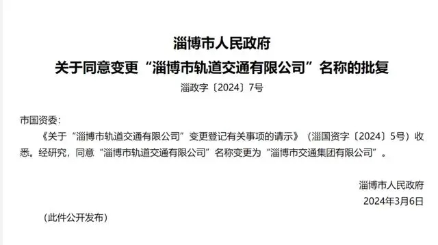 3月6日,淄博市人民政府發布關于同意變更“淄博市軌道交通有限公司”名稱的批復。經研究,同意“淄博市軌道交通有限公司”名稱變更為“淄博市交通集團有限公司”。