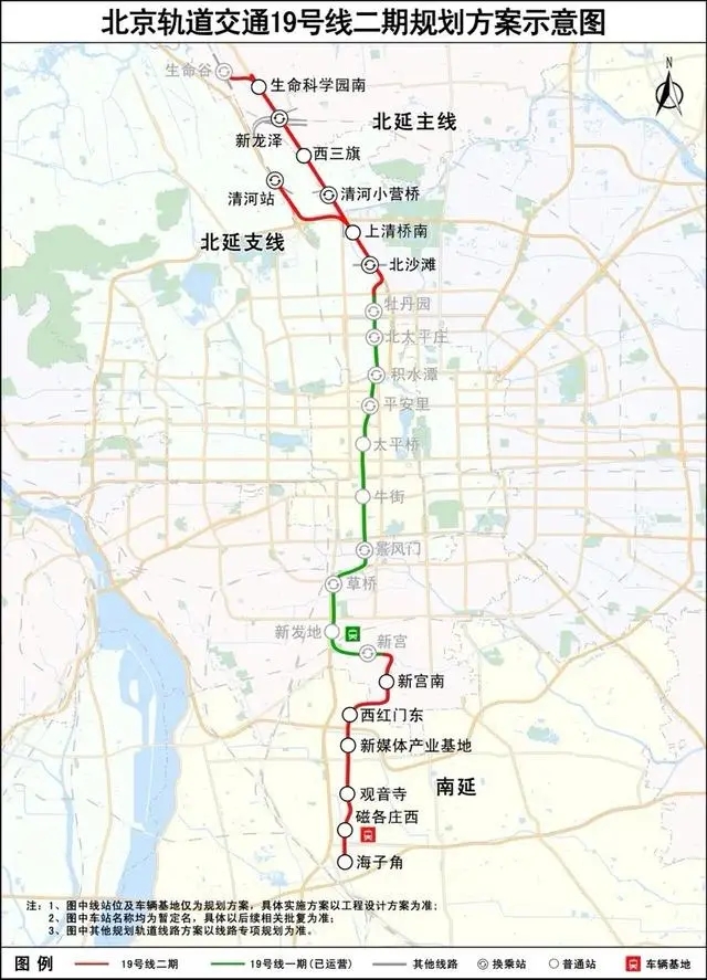 其中,北延主線將在生命谷站換乘市郊鐵路東北環(huán)線、在新龍澤站換乘13號線與東北環(huán)線、在清河小營橋站換乘昌平線、在北沙灘站換乘15號線。北延支線將在清河站換乘13號線和昌平線。而南延線路方向上沒有其他線路,將直達接近南六環(huán)路的海子角站,沒有規(guī)劃換乘站。