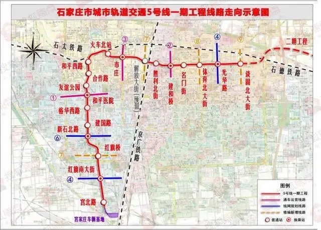 5號線一期工程線路全長約19.9公里,共設(shè)車站19座,平均站間距約1.07公里,設(shè)宮家莊車輛基地一座,線路起自宮北路站,終至談固北大街站,沿紅旗大街、新石中路、友誼大街、規(guī)劃石太北路、市莊路、光華路敷設(shè)。