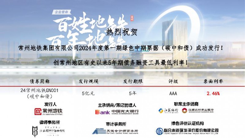5月30日,常州地鐵集團(tuán)成功發(fā)行2024年度第一期綠色中期票據(jù)(碳中和債),發(fā)行規(guī)模5億元,發(fā)行期限5年,由光大銀行牽頭主承銷,江蘇銀行、江南農(nóng)商行作為聯(lián)席主承銷商,票面利率2.46%,創(chuàng)常州地區(qū)有史以來同期限中期票據(jù)發(fā)行利率歷史新低。