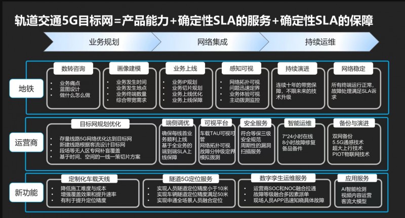 華為5GtoB行業領域高級咨詢專家何濤認為,軌道交通5G公專網應該是一張有確定性體驗保障的5G公專網,那么這張網絡的組成由先進的產品解決方案加上確定性的資源保障服務構成。其中資源保障服務方案將是貫穿5G公專網始終的核心能力,分別由畫像建模,切片定制化,性能可視化,維保智能化等幾個子服務模塊構成;