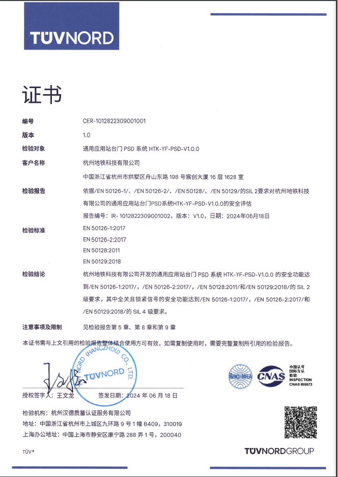 通過此次SIL2安全認證,進一步驗證了自研站臺門系統的安全性,標志著杭鐵科技已具有站臺門系統功能安全正向開發、設計、驗證以及安全體系管理的能力。