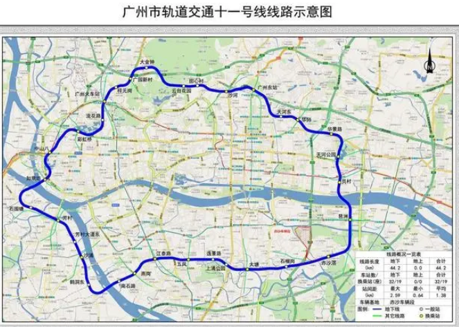地鐵十一號線是廣州首條環(huán)線,全長約44.2公里,串聯(lián)越秀、荔灣、海珠、天河、白云五個區(qū),全線共設(shè)32座車站,其中24座換乘站。