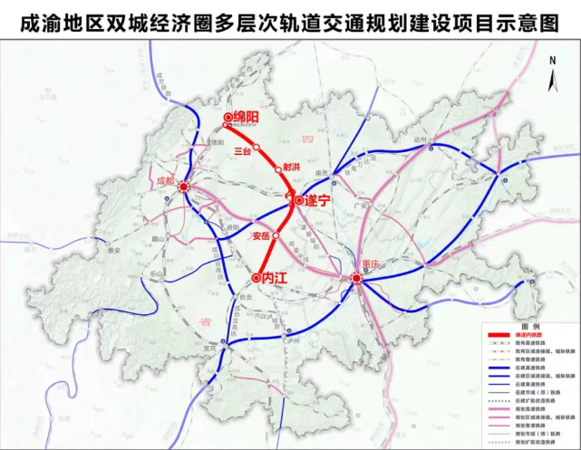 綿遂內鐵路是國家《中長期鐵路網規劃》《成渝地區雙城經濟圈多層次軌道交通規劃》鐵路網的重要組成部分,已列入國家、四川省“十四五”規劃建設項目,是四川繼川南城際鐵路、漢巴南鐵路之后,由地方主導投資建設的第三條高速鐵路項目,對于構建川北、川南、川中區域城際鐵路環線,加快推動成渝地區雙城經濟圈綜合交通運輸體系高質量發展,完善國家綜合立體交通網具有重要意義。按照省政府“一次規劃設計、分步分段建設”的工作安排,先期實施綿陽至遂寧段。