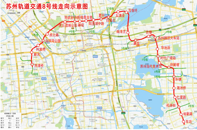 蘇州地鐵8號線全長35.6公里,起于蘇州高新區(qū)西津橋站止于蘇州工業(yè)園區(qū)車坊站,全線設(shè)站28座,其中換乘站12座線路,連接了蘇州高新區(qū)、姑蘇區(qū)、相城區(qū)、工業(yè)園區(qū)等多個城市中心。