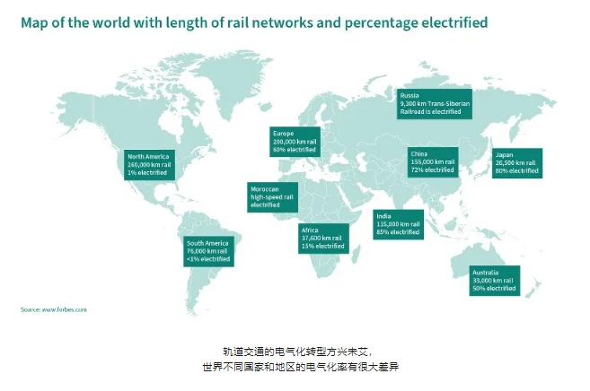與電動汽車不同的是,電力機車已被廣泛使用了一百多年。然而,全球范圍內的軌道交通電氣化轉型仍然方興未艾,不同國家和地區的軌道交通電氣化率存在著很大的差異。軌道交通的電氣化轉型方興未艾,世界不同國家和地區的電氣化率有很大差異。