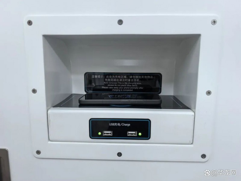 該輛列車車廂共設有三處無線充電設備,乘客只需將手機放在無線充電板上,即可實現充電。考慮到不同手機型號的適配問題,無線充電板下方還配備了USB充電口,每臺設備能同時滿足三部手機充電。