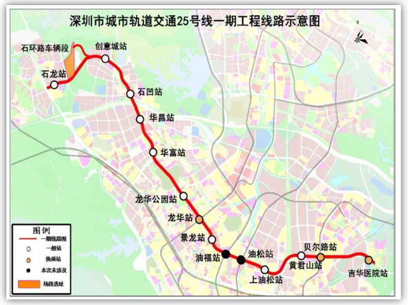 深圳地鐵25號線一期工程起自寶安區(qū)石龍站,終至龍崗區(qū)吉華醫(yī)院站,線路先后途經(jīng)寶安區(qū)石巖街道、龍華區(qū)大浪街道、龍華街道、龍崗區(qū)坂田街道。線路長16.5km,采用全地下敷設(shè)方式。車站14座,換乘站3座,石環(huán)路車輛段1座。