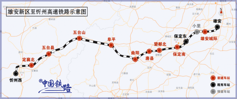 新建雄安新區至忻州高速鐵路起自京雄鐵路雄安站,經河北省雄安新區、保定清苑區及望都、曲陽、阜平等縣,山西省五臺山風景區,忻州市五臺縣、定襄縣,接入忻州西站,正線全長342公里,全線設12個車站(含一個預留車站),雄安新區地下利用擬建的東西軸線隧道工程進行布設,同步建設相關存車場、存車線。