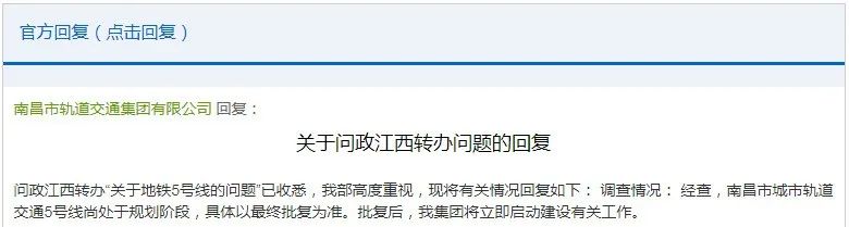 【官方回復(fù)】南昌市軌道交通集團有限公司回復(fù):問政江西轉(zhuǎn)辦“關(guān)于地鐵5號線的問題"已收悉,我部高度重視,現(xiàn)將有關(guān)情況回復(fù)如下:調(diào)查情況:經(jīng)查,南昌市城市軌道交通5號線尚處于規(guī)劃階段,具體以最終批復(fù)為準(zhǔn)。批復(fù)后,我集團將立即啟動建設(shè)有關(guān)工作。