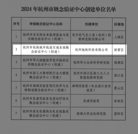 為暢通科技成果轉移轉化“最初一公里”,扎實推進科技成果轉移轉化首選地建設,根據杭州市科學技術局《杭州市概念驗證中心建設工作指引(試行)》,經自主申報、區縣推薦、專家評審、行政決策等程序,杭州市杭鐵城市軌道交通系統概念驗證中心(創建)成功入圍2024年杭州市概念驗證中心創建單位名單。該驗證中心是軌道交通行業首家概念驗證中心(創建),也是杭州市國有企業涉足概念驗證領域的一次重大嘗試。