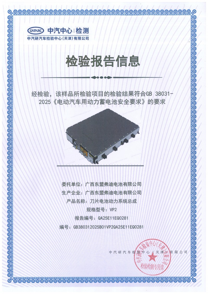 近日,比亞迪刀片電池和閃充刀片電池雙雙提前通過最新國標GB 38031-2025《電動汽車用動力蓄電池安全要求》全項檢測,并獲得中汽研汽車檢測中心專業認證證書,提前滿足新國標要求。