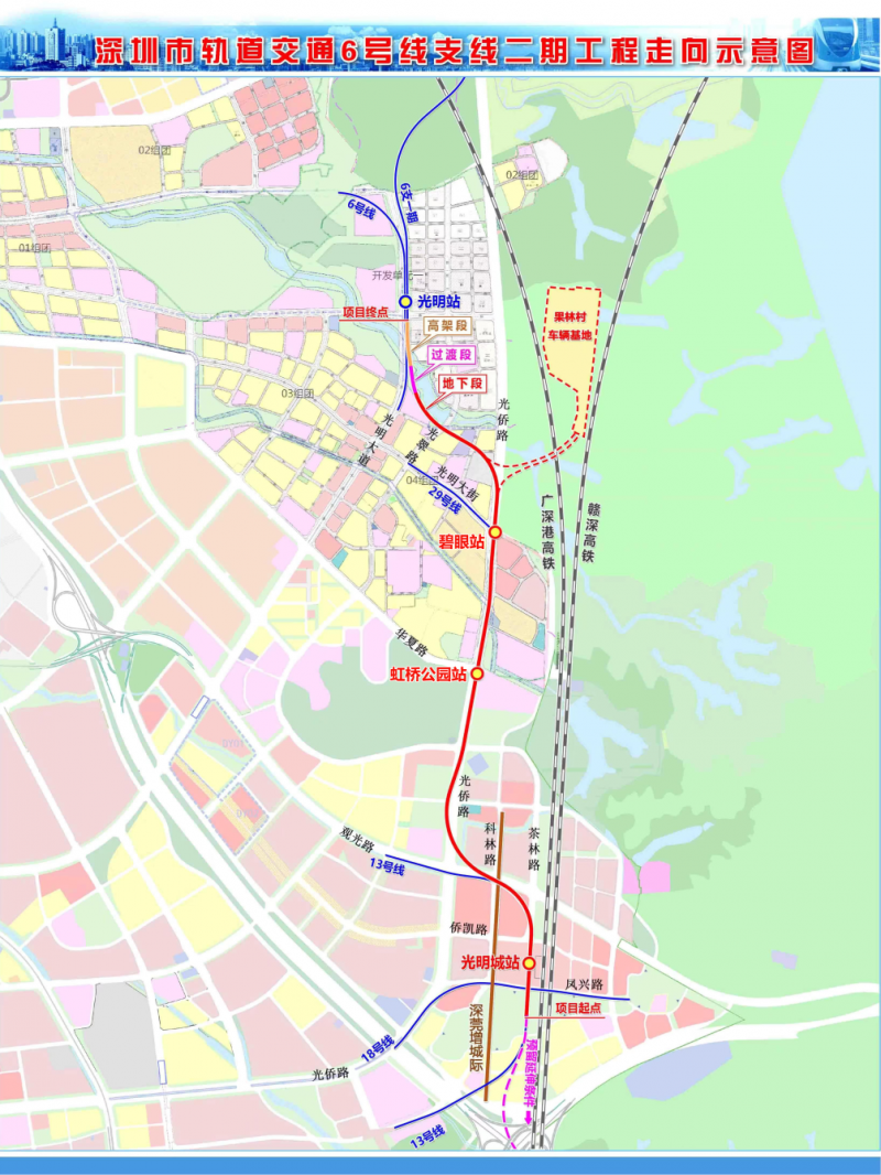 6號(hào)線支線二期工程敷設(shè)在光明區(qū)內(nèi),起自6號(hào)線支線一期工程光明站(原翠湖站),終至光明城站 ,線路全長(zhǎng)約4.944km,共設(shè)3站。站點(diǎn)為:碧眼站、虹橋公園站、光明城站。線路共配屬車輛4列(24輛),采用4動(dòng)2拖6輛編組B型車,DC1500V架空接觸網(wǎng)/接觸軌供電方式,最高運(yùn)行時(shí)速120公里。