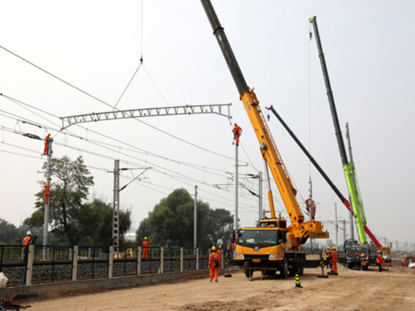 9月13日,中午12點(diǎn)15分,在7臺吊車引擎的轟隆聲中,張家口南站普速場8組硬橫梁在一個(gè)小時(shí)封閉施工點(diǎn)內(nèi)成功組立并順利完成張南站引入京張高鐵正線的第二次接觸網(wǎng)過渡硬橫梁架設(shè)工作。