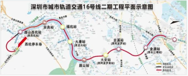 深圳地鐵16號線二期由一期大運站引出,終點至園山西坑站,全長約9.46公里,共8站8區間1場1線,其中換乘站2座,全部采用地下敷設方式,其中福坑站、大康站、大安站為裝配式地鐵車站。
