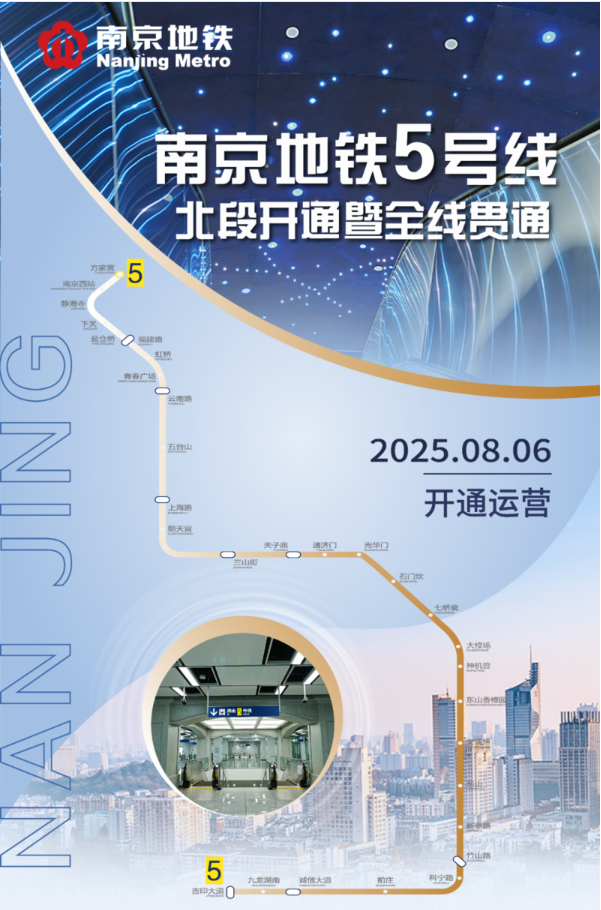 南京地鐵5號線北段于8月6日6時正式開通運營,隨著北段的開通初期運營,標志著地鐵5號線實現全線貫通運營。屆時,南京地鐵13條已開通線路的運營里程將由484公里增加至508公里,車站總數由234座增加至255座。
