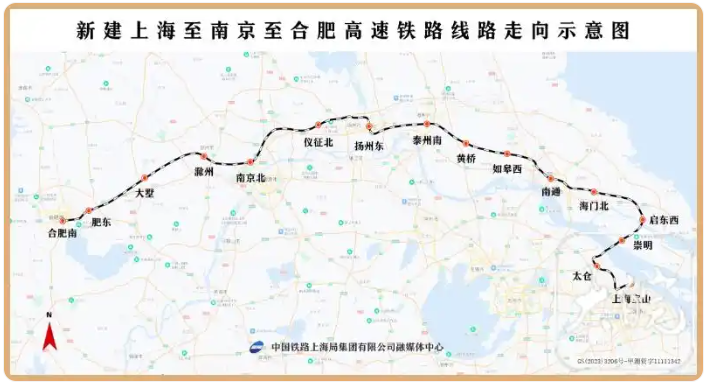 滬寧合高鐵是滬渝蓉高鐵的東段線路、國家"八縱八橫"高速鐵路網沿江通道的重要組成部分,起自上海市新建上海寶山站,經江蘇省蘇州市、南通市、泰州市、揚州市、南京市,以及安徽省滁州市、合肥市,接入既有合肥南站,線路全長約554公里(其中安徽段130.88公里),設計時速350公里,全線設16座車站(其中新建10座車站)。