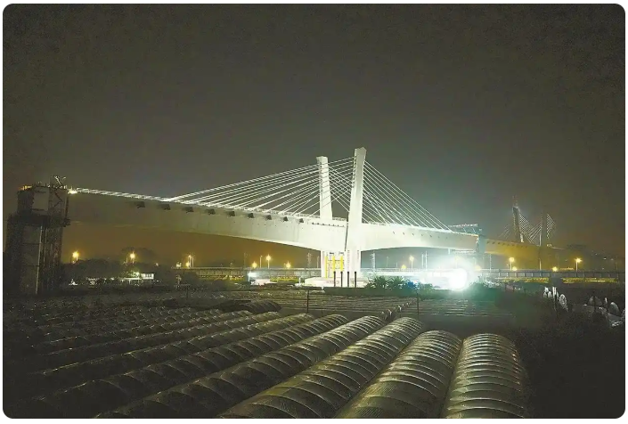 10月16日凌晨,隨著兩臺(tái)液壓連續(xù)張拉千斤頂持續(xù)精準(zhǔn)牽引“發(fā)力”,由廣州地鐵集團(tuán)負(fù)責(zé)建設(shè)管理、中鐵廣投總承包管理、中鐵廣州局承建的珠三角城際軌道交通廣佛環(huán)線佛山西站至廣州北站段工程(以下簡(jiǎn)稱“廣佛西環(huán)城際”)全線唯一轉(zhuǎn)體橋——官窯西南涌特大橋(124+230+124)米斜拉橋猶如空中“芭蕾舞者”平穩(wěn)旋轉(zhuǎn),順利轉(zhuǎn)體跨越廣珠鐵路、廣佛肇高速公路等重要建構(gòu)筑物,實(shí)現(xiàn)“毫米級(jí)”精準(zhǔn)對(duì)接,標(biāo)志著項(xiàng)目控制性節(jié)點(diǎn)取得重大突破,為全線橋梁貫通奠定了堅(jiān)實(shí)基礎(chǔ)。